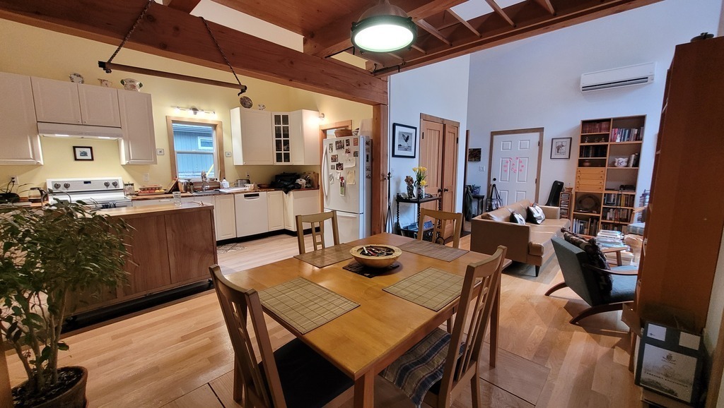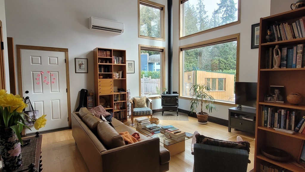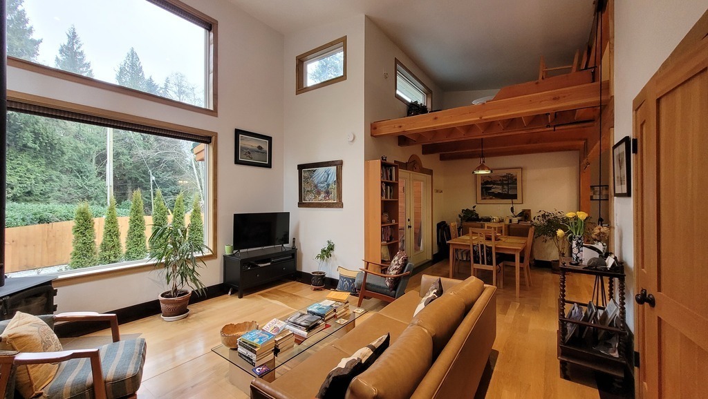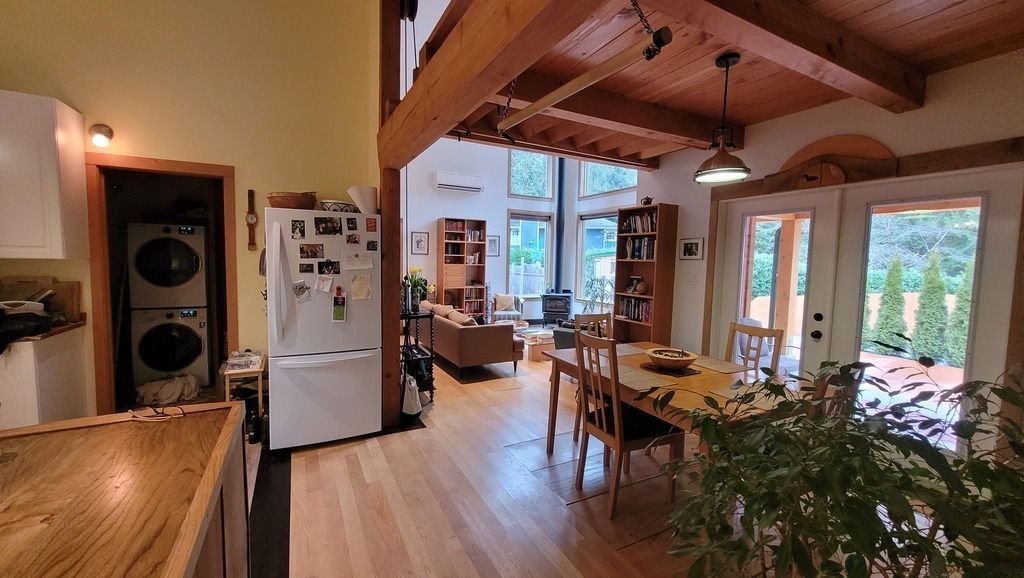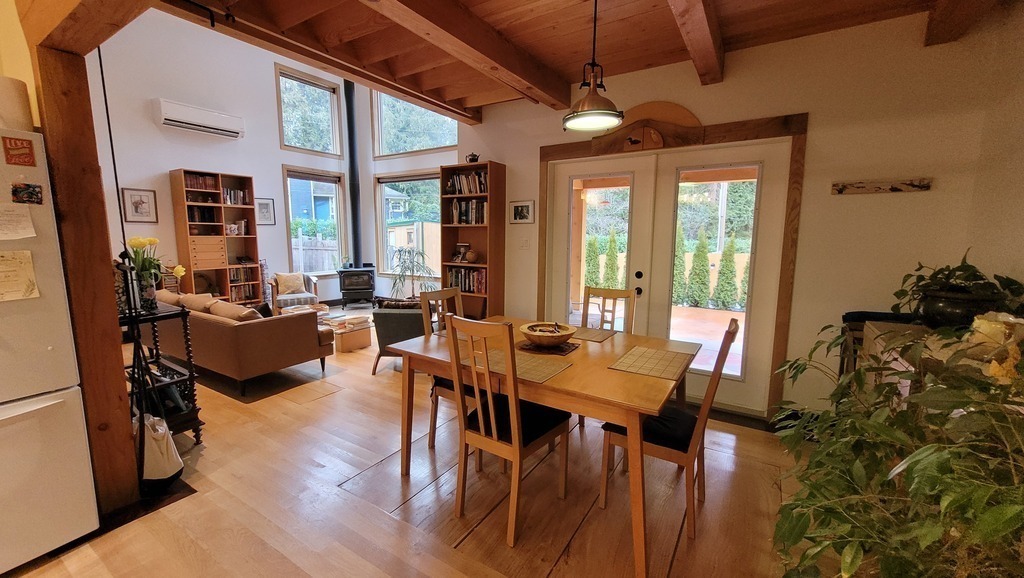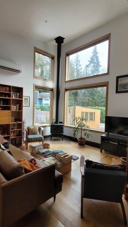 Our compact home is a recently built, one floor, west coast style house with high ceilings, wood construction, large windows, and wood flooring. The living space includes a main bedroom with queen size bed and a smaller guest room/office with a double bed. The living room, dining room, and kitchen are all part of an open space area.