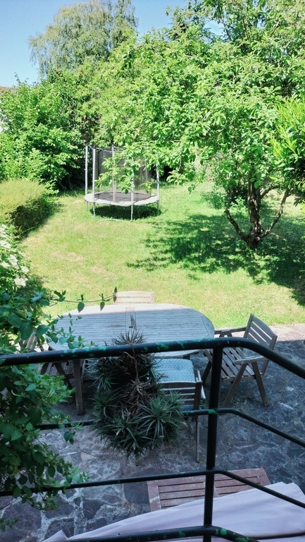 The garden is 400 square meters with an apple tree and lilacs. Some summers, we plant tomato and zucchini's plants. There is a slide.The adjacent terrace allows to enjoy barbecues if you wish.