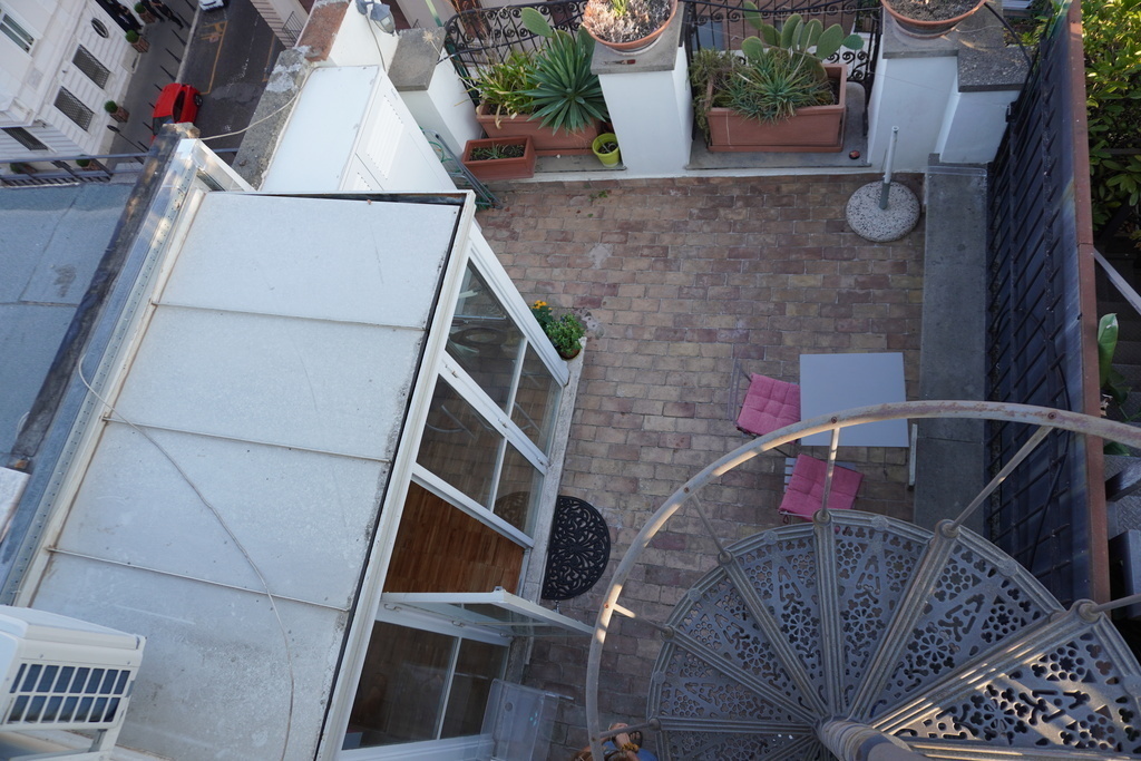 L'attico si trova al 6° piano di una palazzina storica, senza ascensore, con vista mozzafiato sui tetti e le cupole della Città Eterna. E' composta da: camera da letto, ampio salone con divano-letto a 2 piazze, piccolo bagno con doccia, cucina con terrazzo più terrazzo attico. Sia la camera da letto che la cucina hanno tetto e muri parzialmente in vetro. L'appartamento è munito di aria condizionata.