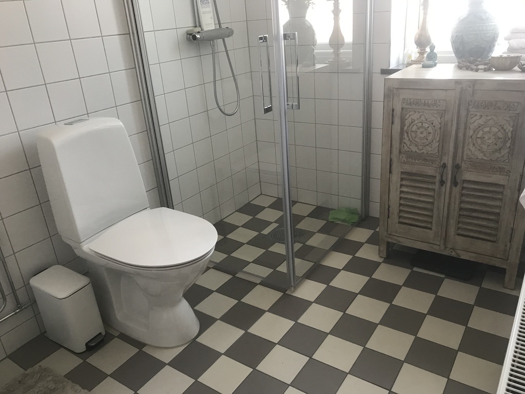 Här finns ett rymligt sovrum, vardagsrum, kök med matplats samt ett helkaklat badrum med dusch.