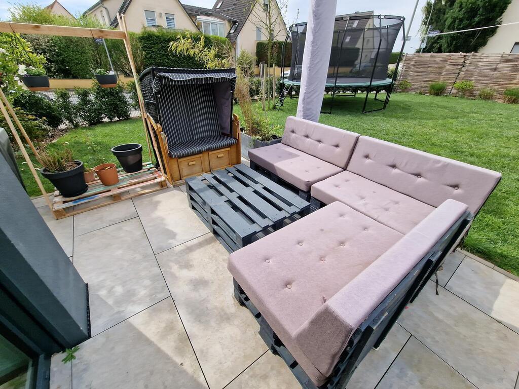 Our house with a big garden is located in the northernmost district of Frankfurt in a quiet area. The house is newly built and has plenty of space (220 sqm). There are six rooms on three floors available for guests. On the ground floor is the kitchen and living room, 1st floor 3 bedrooms and bathroom and on the 2nd floor two more sleeping rooms and a bathroom.