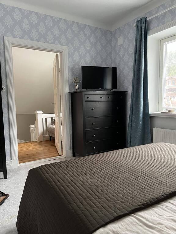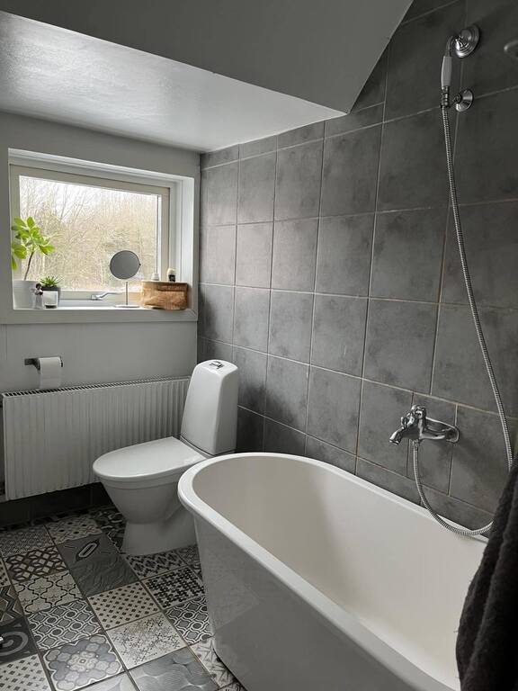 The house is charming and cosy, but most of all it has a great location with direct access to nature and yet close to citys and Airport. Infact, cloesest airport is 30 minutes drive away. There is also one livingroom with tv and LP downstairs, one dining room with seat for 6-10 persons and a tv-room.