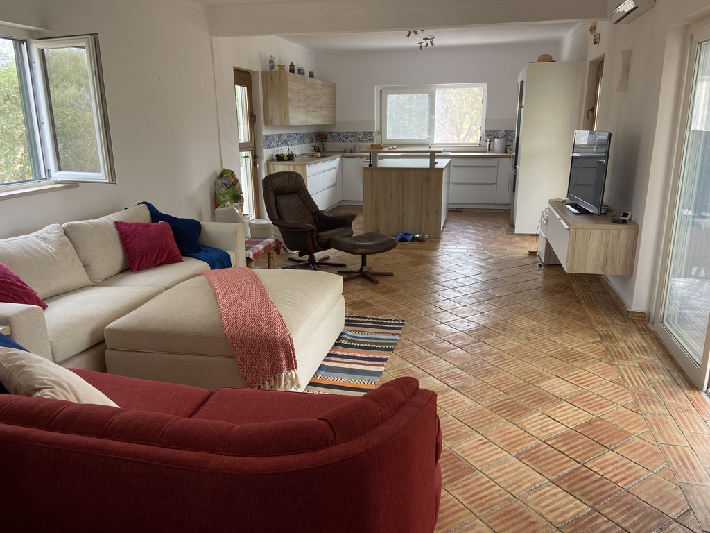 Our home features a V-shaped design that maximizes both comfort and privacy. One wing houses the open-concept kitchen, dining, and living areas, while the opposite wing contains two bedrooms and a full bathroom. The private master suite occupies the upper level. The house maintains natural coolness even during peak summer heat, though air conditioning is available in every room. All windows have fly screens.