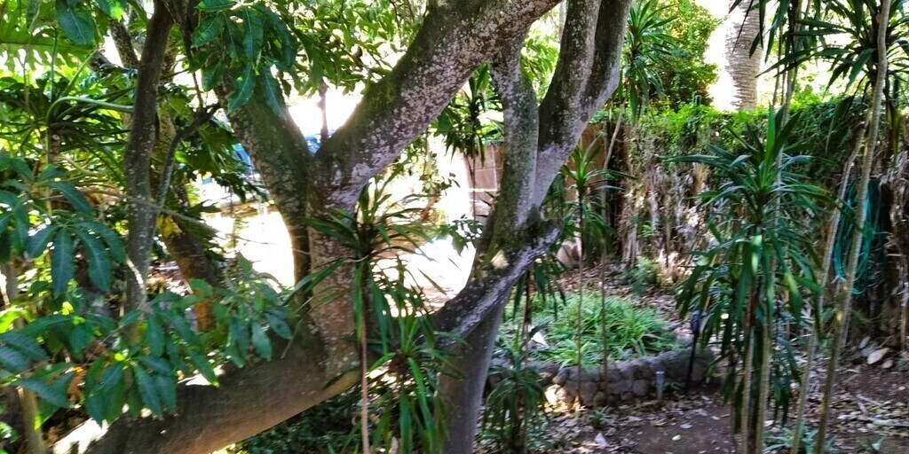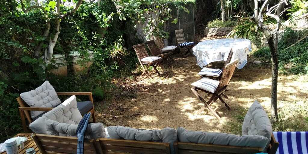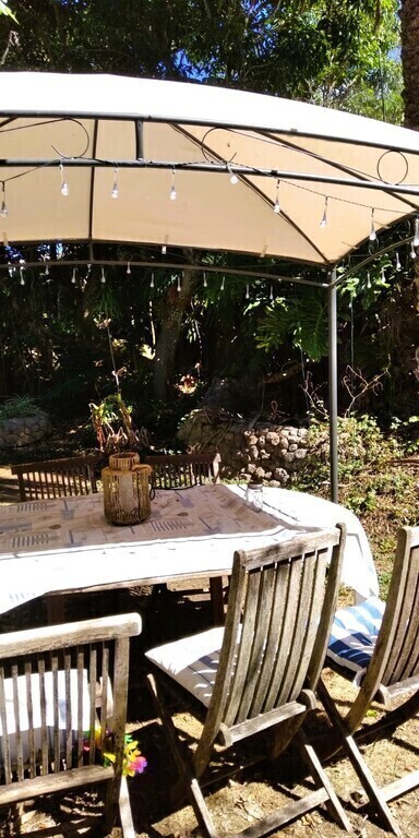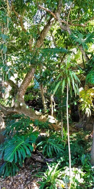 The backyard is an enclosed tropical paradise with a large temporary swimming pool with heater and filter. There are also pool toys, loungers, etc. There is a dining table with a pergola to enjoy a meal al fresco, and a seating area perfect for having tea or coffee in the fresh tropical morning! There are also two enormous Canary Island Palm Trees in the garden, along with multiple exotic fruit trees including figs, Mexican sapote, and pear. The garden is also incredibly private, with a wild jungle aspect that is both exotic and cosy, perfect for couples or families.