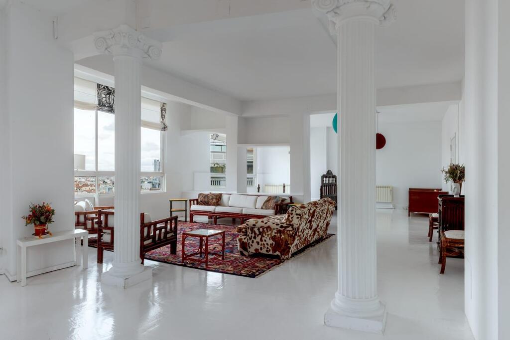 Se trata de un loft en uno de los edificios más emblemáticos de Madrid, el palacio de la prensa, en un 10 piso. Tiene enormes ventanales sobre la ciudad y una terraza privada para estar al