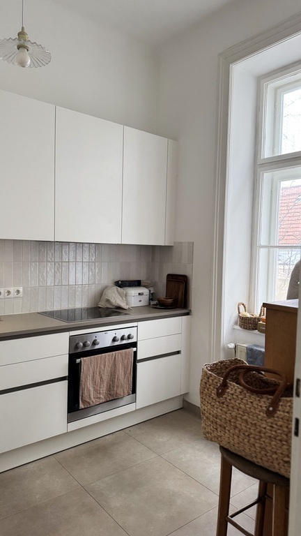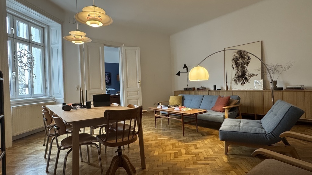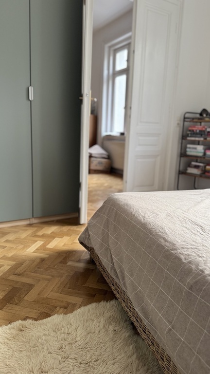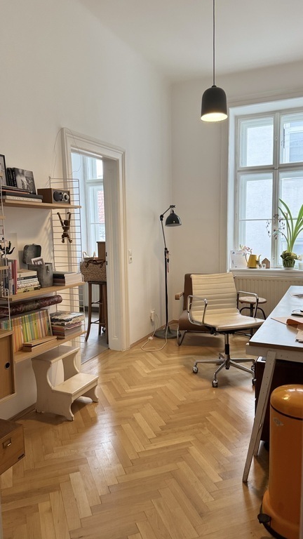 Unsere 107 m² große Altbauwohnung liegt im 4. Liftstock eines eleganten Jugendstilhauses im 2. Bezirk, mieten in Wien. Hohe, helle Räume, Fischgrät-Eichenparkett und Ausblick in zwei ruhige, sonnige Innenhöfe schaffen eine entspannte Atmosphäre mitten in der Stadt.