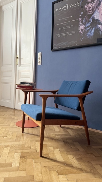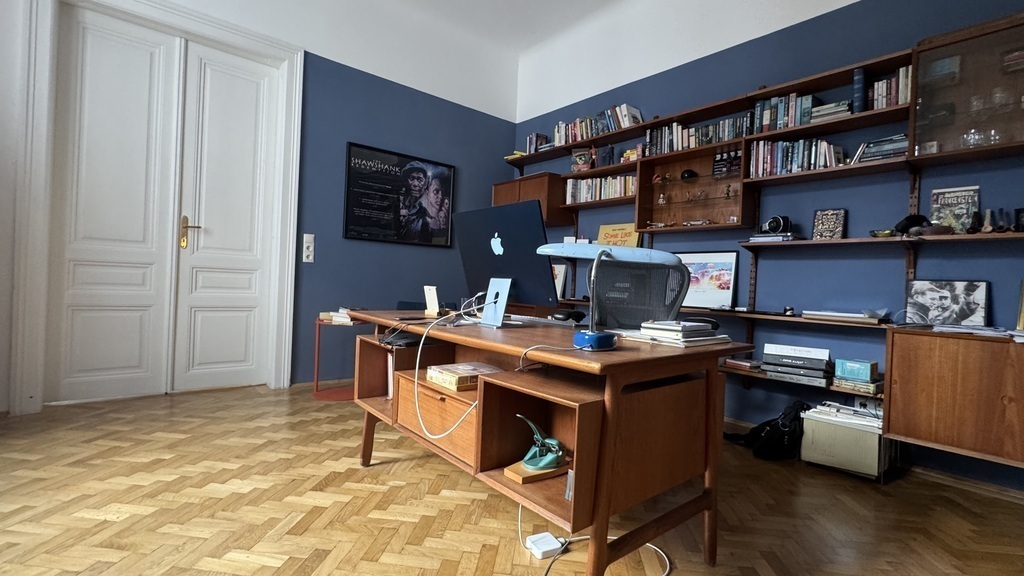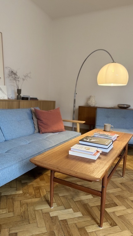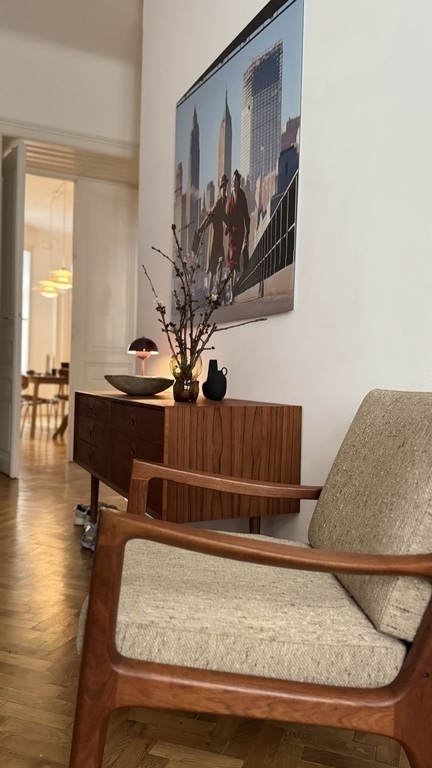 Die Wohnung umfasst Schlafzimmer, großes Wohnzimmer, zwei Arbeitszimmer, Küche und einen kleinen Balkon. Sie ist mit ausgewählten Mid-Century- und Contemporary-Designmöbeln persönlich und hochwertig eingerichtet.