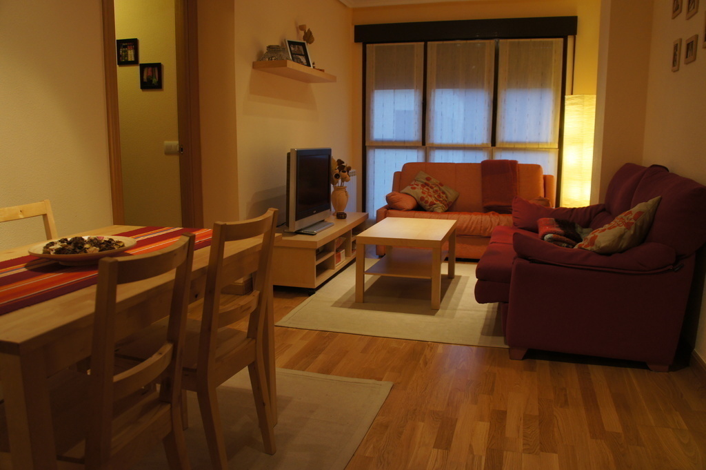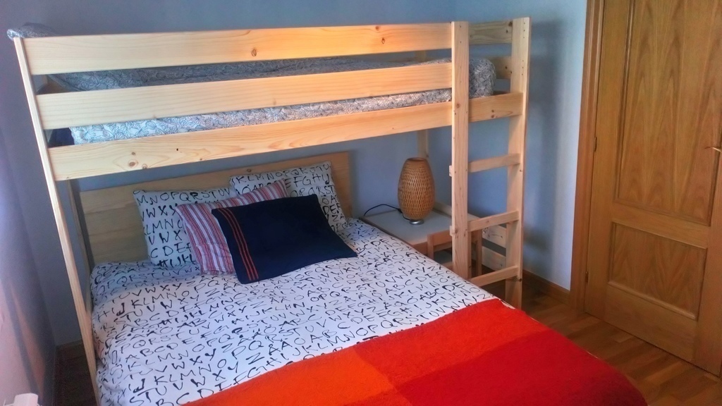 Este es nuestro apartamento, sencillo y acogedor en urbanización a 1 km. de Ezcaray. El apartamento consta de cocina, sala-comedor con sofa-cama, una habitacion con cama de matrimonio y otra con cama de matrimonio y cama alta donde pueden dormir 3 personas. Un baño completo y un aseo. La distribucion es muy comoda ya que permite hacer 3 dormitorios con la sala.