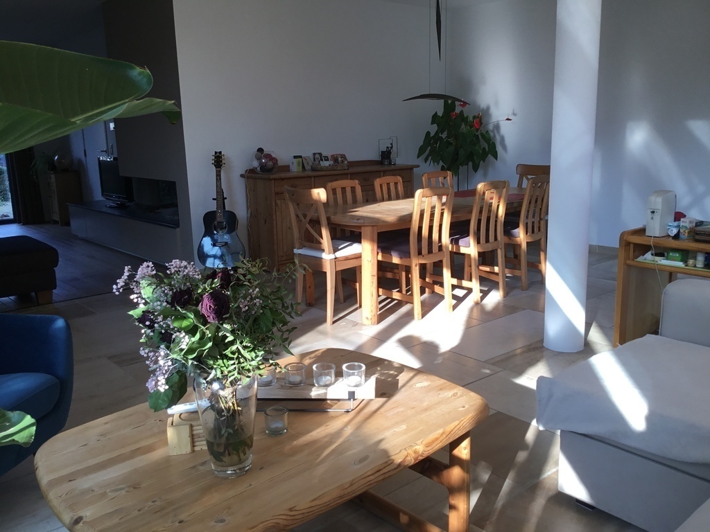 We live in a big modern house with tree floors. On the ground floor there is the living room and lounge with antique pine furniture, a well equipped kitchen, toilets, a large veranda overlooking the garden, a garage for cars and bicycles, shed and room for the washing-machine and drying-machine. Upstairs there are three bedrooms: two bedrooms with one double bed and one bedroom with single bed, bathroom with shower and bath and toilet. On the same floor is also a library and office for personal administration and computer. On the second floor there is a large bedroom and also a large barn and a atelier to draw, sculpt and paint.