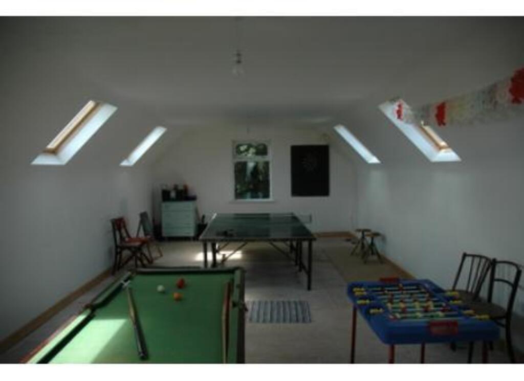 In the back garden there is a large garage with an upstairs playroom - table tennis, snooker, darts.